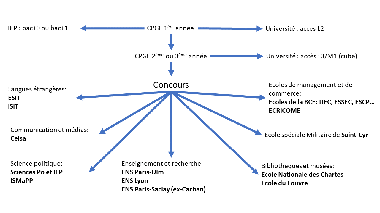 Plus généralement, la CPGE constitue une excellente préparation initiale à de très nombreux types de concours, notamment les concours d'admission aux IEP ou des concours plus spécialisés : concours d'entrée dans les écoles de journalisme, concours de la fonction publique, concours d'entrée de l'Ecole du Louvre, de l'école nationale supérieure du paysage, etc.